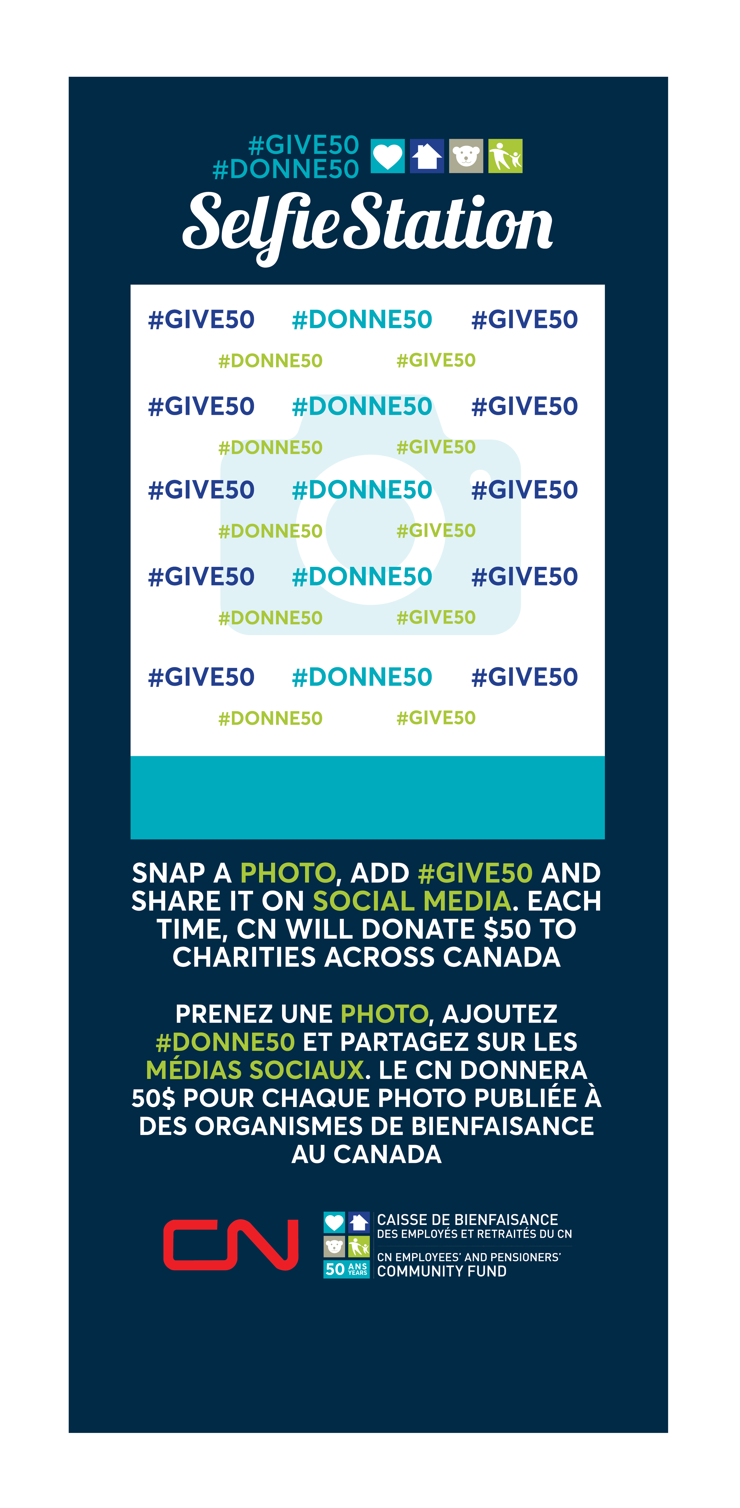 • Prenez une photo à la « Station Selfie » #DONNE50 qui sera installée à des emplacements clés du CN et partagez sur les médias sociaux en utilisant #DONNE50. Pour chaque photo publiée, le CN donnera 50 $ à la Caisse de bienfaisance (limite d’une photo par participant).
