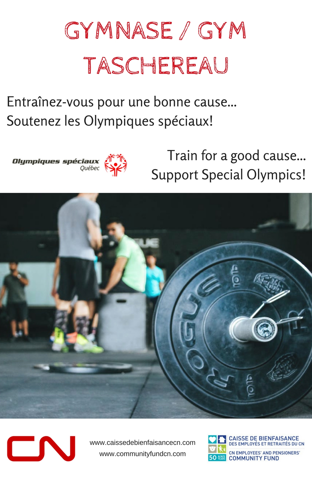 Un nouveau gymnase a ouvert ses portes à Taschereau, en plus de celui qui se situe au siège social. Profitez de votre passage à la salle d'entrainement pour faire un don qui sera entièrement remis aux Olympiques spéciaux Québec. Vous trouverez une boîte prévue à cet effet dans le gymnase de Taschereau. Vous pouvez également supporter la cause en faisant un don en ligne.