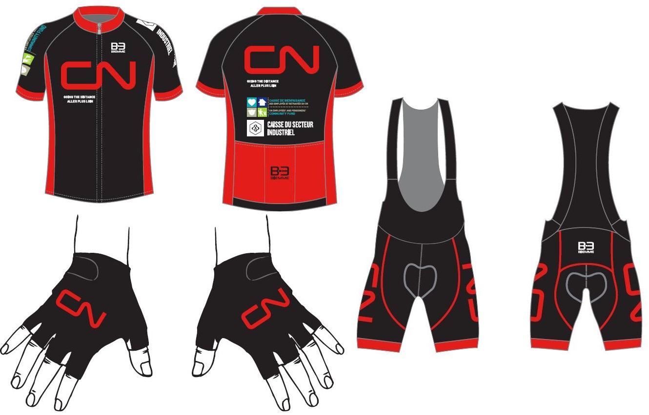 Nous vous présentons ici-bas la combinaison de l'équipe CN, il n'est pas obligatoire de participer au Vélotour SP pour vous la procurer. Veuillez contacter Louis Moreau au 514-399-5751 ou louis.moreau@cn.ca pour plus de détails.