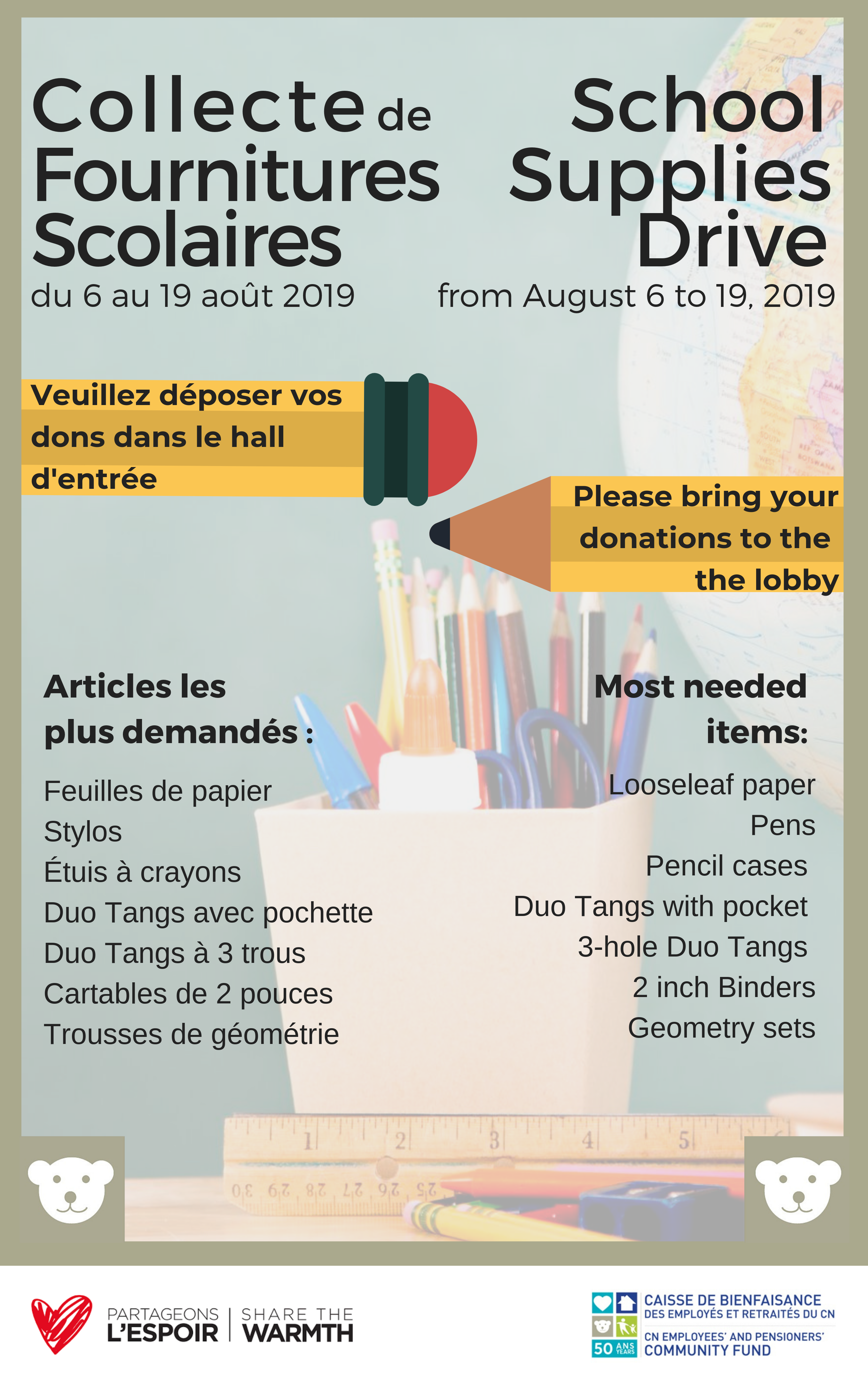 Pour les familles défavorisées, la rentrée est souvent synonyme de dépenses importantes et difficiles à assumer, notamment au chapitre des fournitures scolaires. Lors de votre magasinage de la rentrée, pourquoi ne pas acheter quelques articles de plus et ainsi aider des jeunes dans le besoin à bien démarrer l’année? En collaboration avec la Caisse de bienfaisance des employés et retraités du CN, deux de vos collègues, Hilary Kwok (Planification financière) et Denis Latreille (Comptabilité), vous invitent à participer à une collecte de fournitures scolaires. Vos dons seront remis à l’organisme Partageons l’espoir, qui veillera à distribuer les articles auprès de quelque 10 000 jeunes élèves montréalais dans le besoin.
