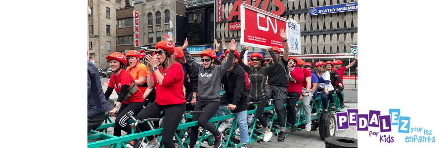 Faites partie d’une activité inoubliable : Pédalez pour les enfants ! Le jeudi 13 juin montez à bord du vélo géant à 30 places et pédalez pour la Fondation de l’Hôpital de Montréal pour enfants. Chaque participant doit amasser un minimum de 250 $ pour participer. Le CN jumelra les dons jusqu'à 7 500 $, afin d'amasser un total de 15 000 $ pour l'équipe.
