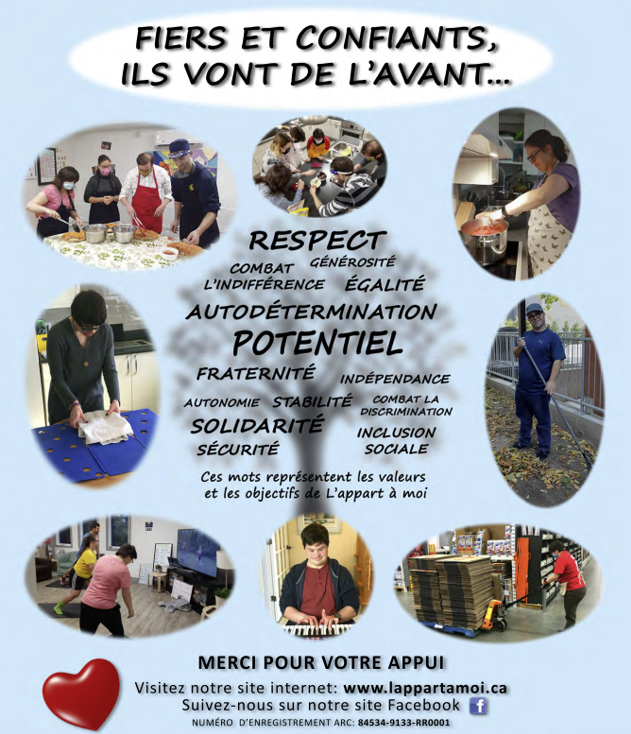 L’appart à moi est un projet qui a vu le jour grâce à un groupe de parents désireux d’offrir un milieu de vie stable, permanent et sécuritaire à leurs jeunes adultes ayant une déficience intellectuelle.  Situé au Québec, L’appart à moi a construit un immeuble pouvant accueillir 9 jeunes qui sont toujours en quête d’une indépendance et d’une autonomie grandissante.