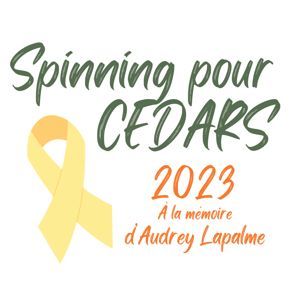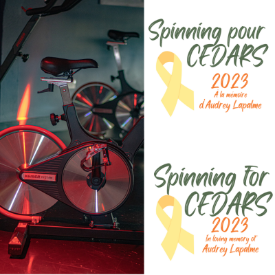 Cette année, à la mémoire d'Audrey, nous organisons un événement de spinning au B-Cycle Vieux Port afin de recueillir des fonds pour la Fondation du cancer des Cèdres. Notre objectif est d'amasser 20 000 $ et nous demandons à ceux qui souhaitent participer à un cours de spinning de 30 minutes de contribuer un minimum de 100 $. Un reçu d’impôt sera émis pour votre don. Le département de Planification financière du CN couvrira les coûts de l'événement afin que tous les profits soient versés directement à la Fondation du cancer des Cèdres.