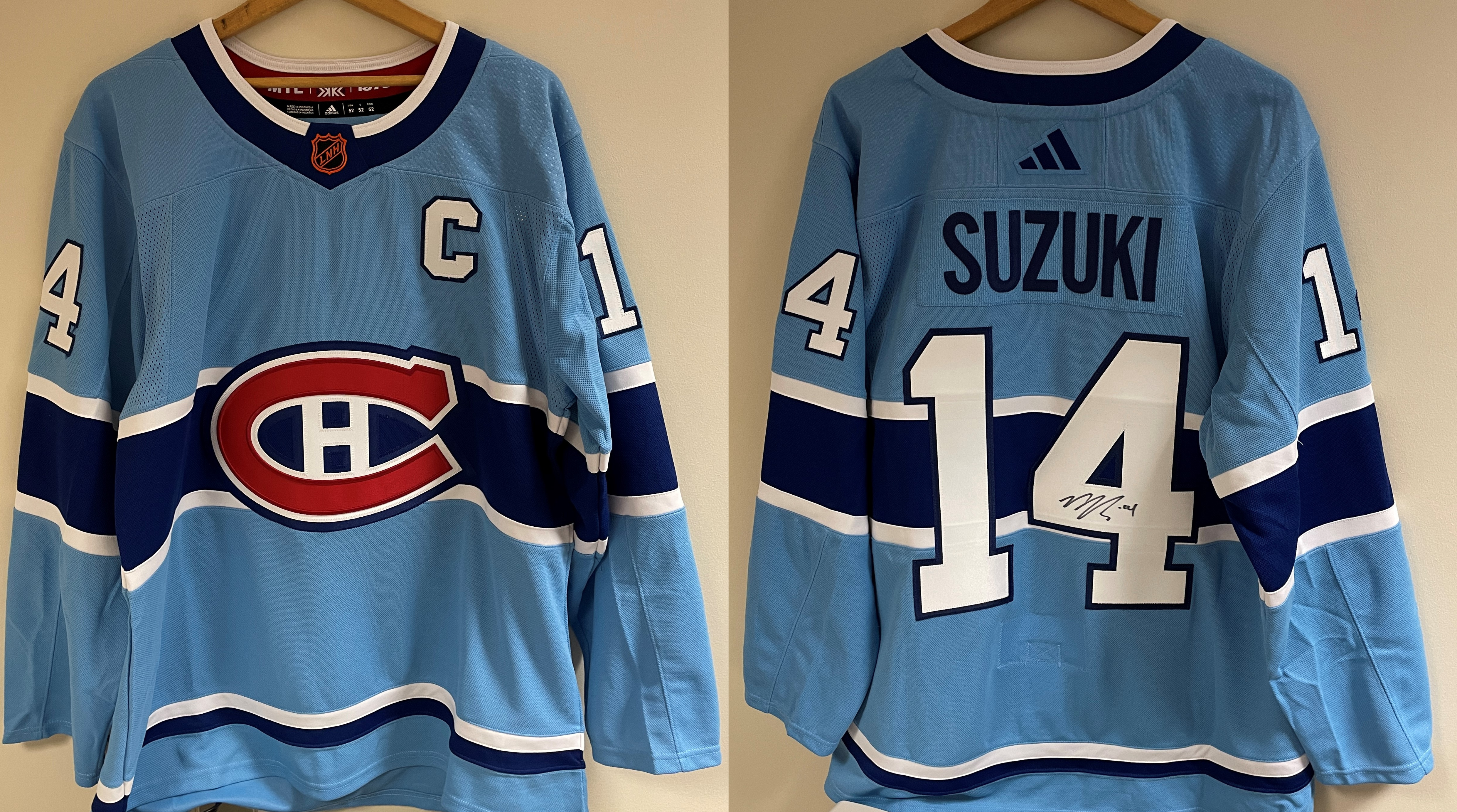 Dans le cadre de la campagne 2023 de collecte de fonds de la Caisse de bienfaisance, vous pouvez vous procurer des participations au tirage afin de courir la chance de gagner un chandail des Canadiens de Montréal autographié par Nick Suzuki.
